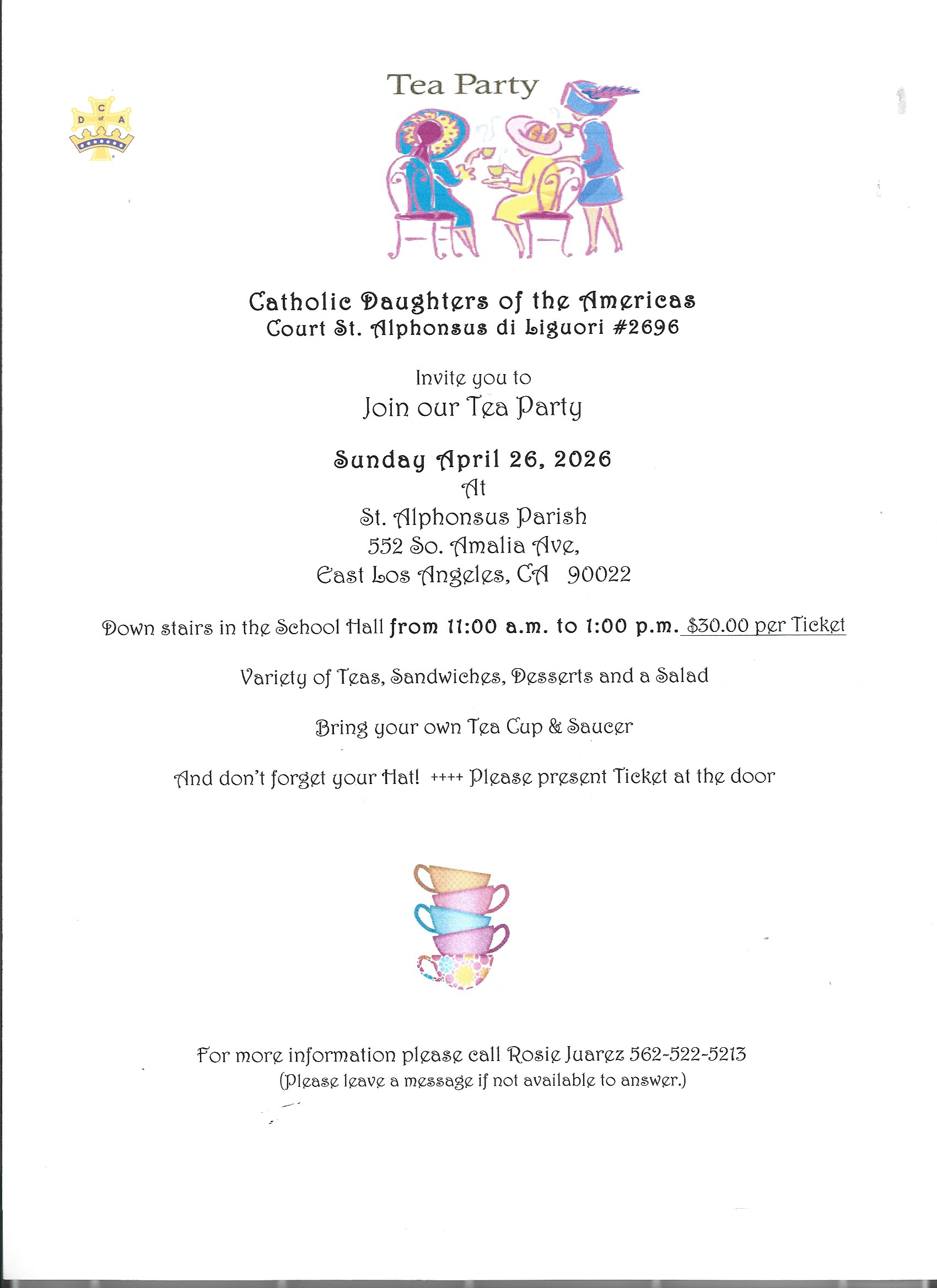 Court St. Alphonsus de Liguori #2696 invites you to a Tea Party on April 26, 2026 from 11 AM to 1 PM at St. Aphonsus Parish Hall, 552 South Amalia Avenue, Los Angeles, CA 90022. Download Flyer for more information.